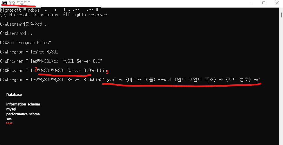 7-3. 'mysql -u {마스터 이름} --host {엔드 포인트 주소} -P {포트 번호} -p'을 입력