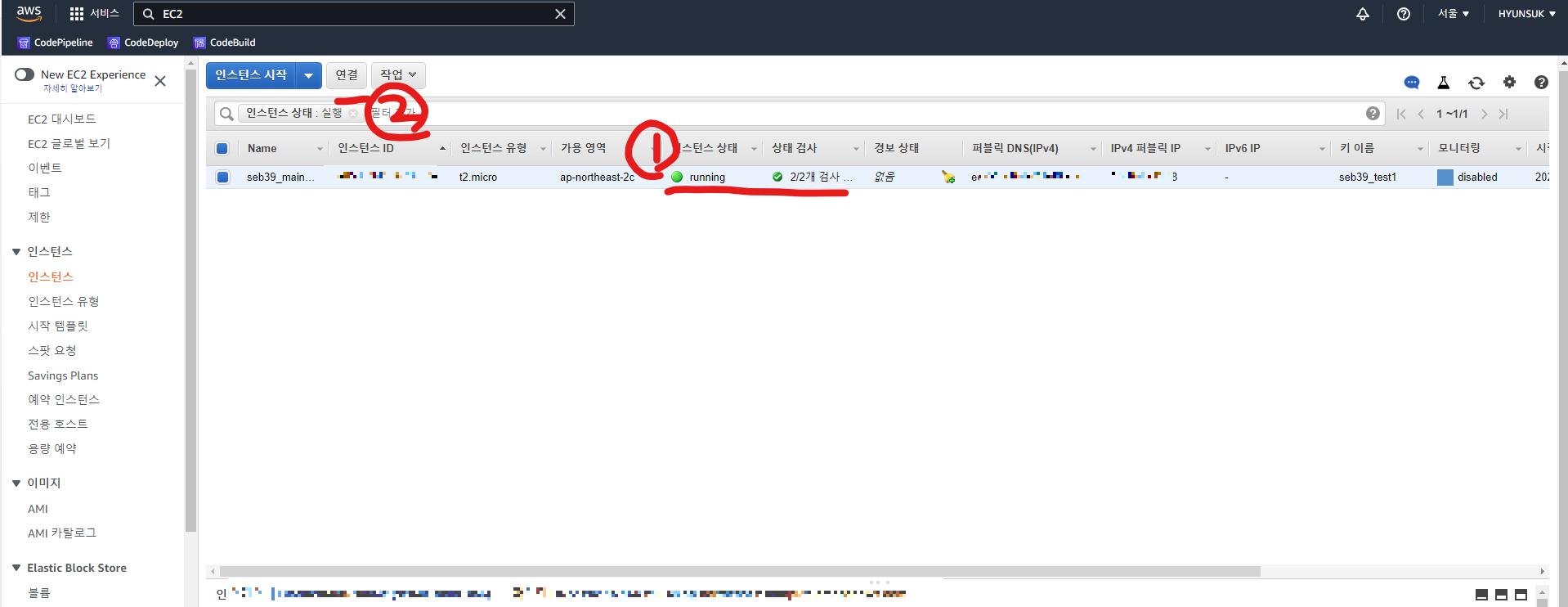 6-1. 인스턴스 상태에 초록불이 들어오고 상태검사가 연결중 -> 2/2개 검사로 변할 때 까지 기다리기