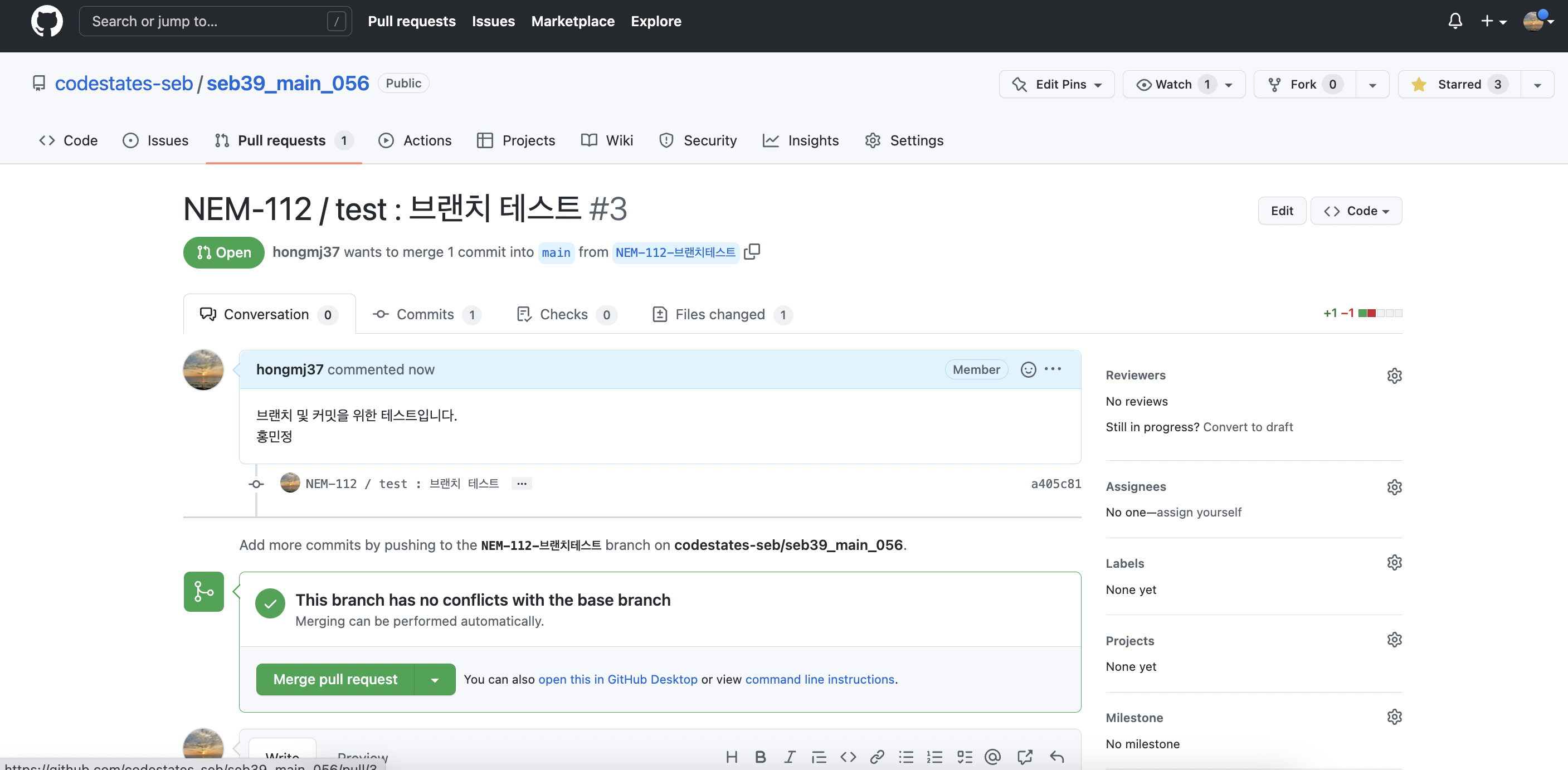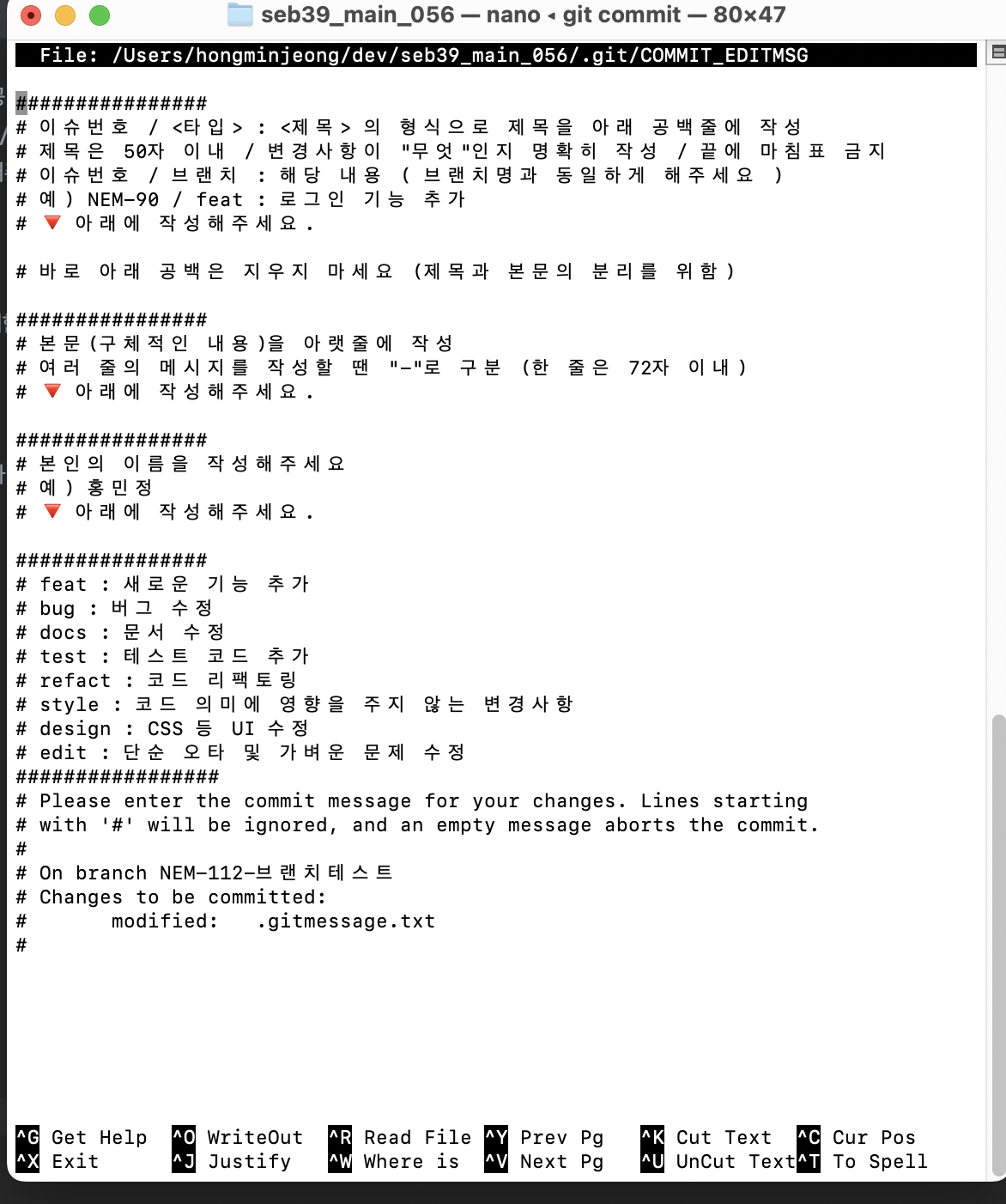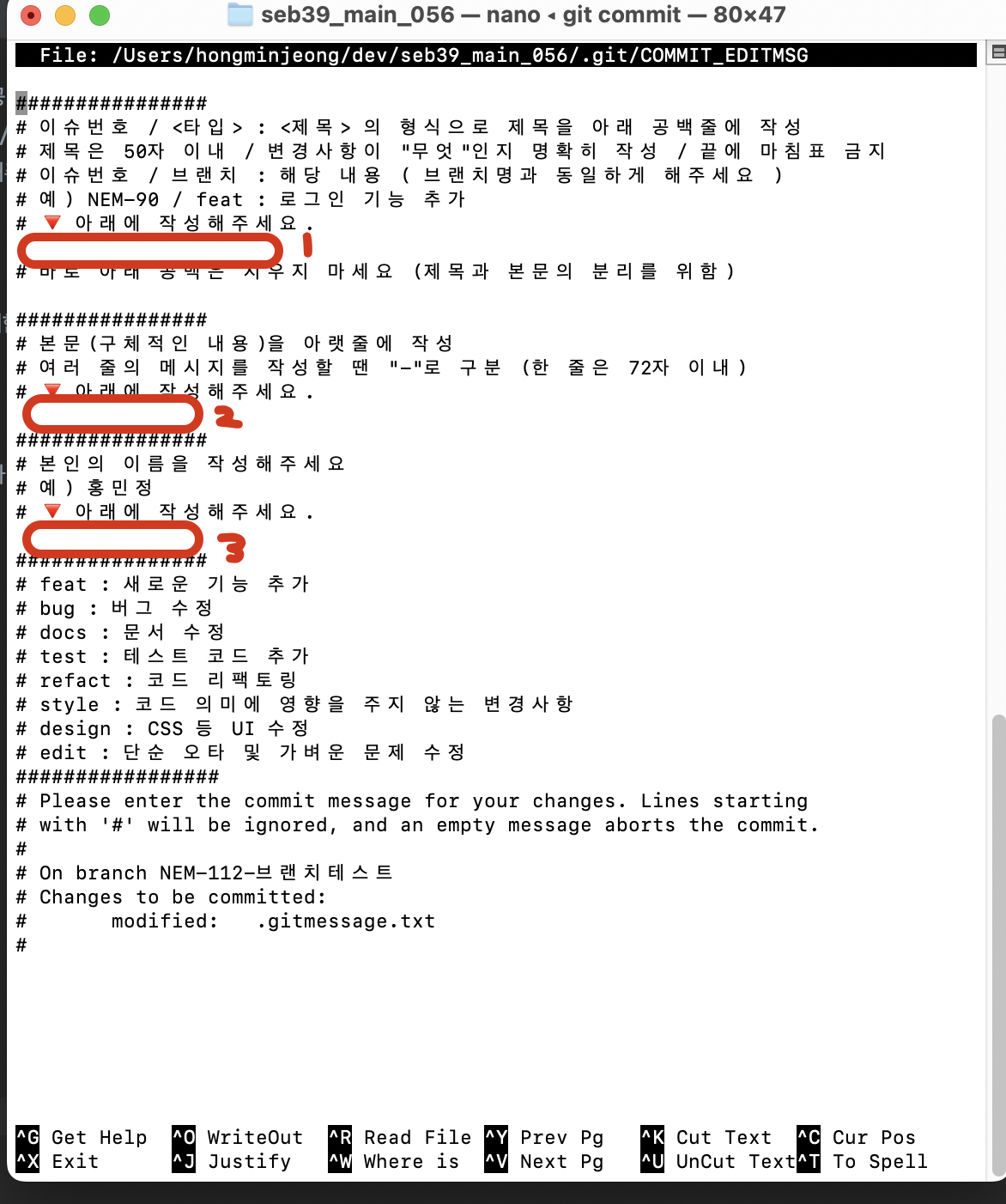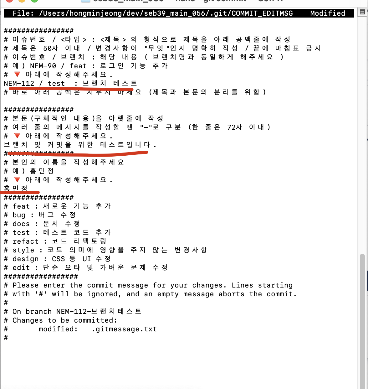 ex) 브랜치 이름이 NEM - 112 - 브랜치 테스트 일때,