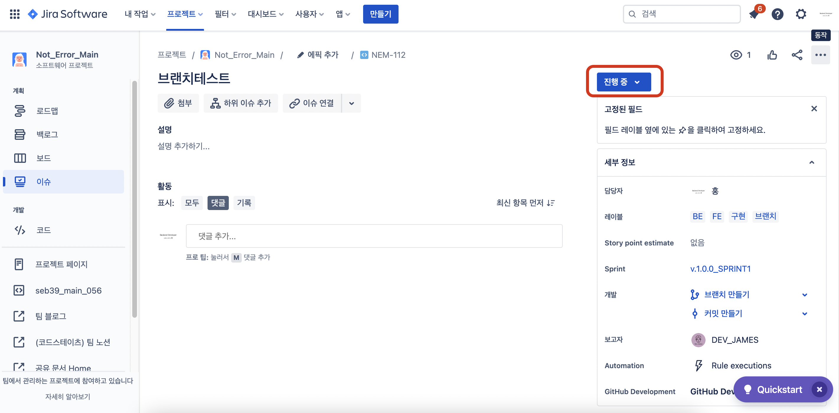 - 이슈를 진행중으로 바꾸면 각 이슈에 맞는 새로운 브랜치가 생성됩니다.